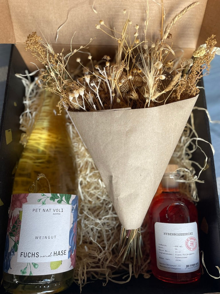 Vi pakker vin fra Flaskehalsen, eddike fra Bornholms Vinegar Company og blomster fra Blomster – enkelt, ærligt og lige til at give videre.